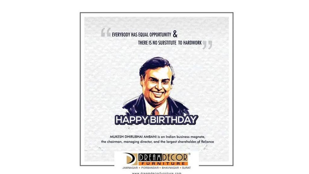"మహోన్నత వ్యక్తిత్వం.. దార్శనిక నాయకత్వం! ధీరూభాయ్ అంబానీ గారి వారసత్వాన్ని స్వీకరించి, తనదైన శైలిలో దేశ ప్రగతికి బాటలు వేస్తున్న శ్రీ ముఖేష్ అంబానీ గారికి పుట్టినరోజు శుభాకాంక్షలు. తండ్రికి తగ్గ తనయుడిగా, ప్రపంచ ఆర్థిక రంగంలో భారతదేశ కీర్తి పతాకాన్ని ఎగురవేస్తున్న మీకు సంపూర్ణ ఆయురారోగ్యాలు కలగాలని కోరుకుంటున్నాము. - Akaasavani News