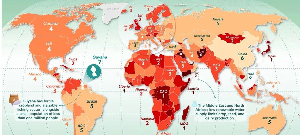 ప్రపంచ దేశాల ఆహార స్వయం సమృద్ధిపై జరిగిన తాజా అధ్యయనం ఆసక్తికర విషయాలను వెలుగులోకి తీసుకు వ చ్చింది. గయానా మాత్రమే ప్రజలకు అవసరమైన అన్ని 7 ప్రధాన ఆహార విభాగాలను దేశీయంగా ఉత్పత్తి చేయగలిగిన దేశంగా వెల్లడైంది. అమెరికా, చైనా వంటి అగ్ర దేశాలు కూడా కనీసం ఒక ఆహార విభాగంలో ఇతర దేశాలపై ఆధారపడు తున్నాయి. సంపన్న దేశాలు కూడా పూర్తి స్థాయి ఆహార స్వయం సమృద్ధి సాధించలేకపోతున్నాయని అధ్యయనం స్పష్టం చేసింది.
